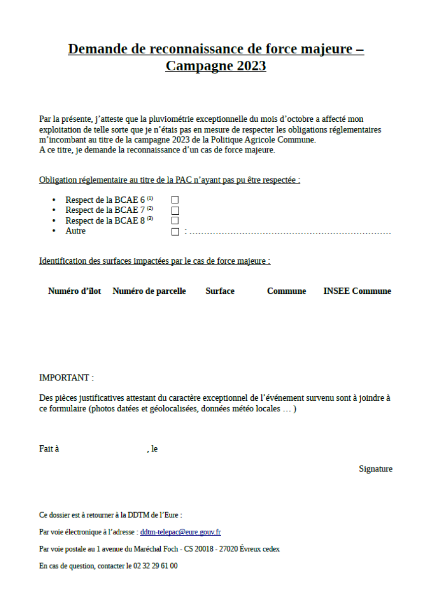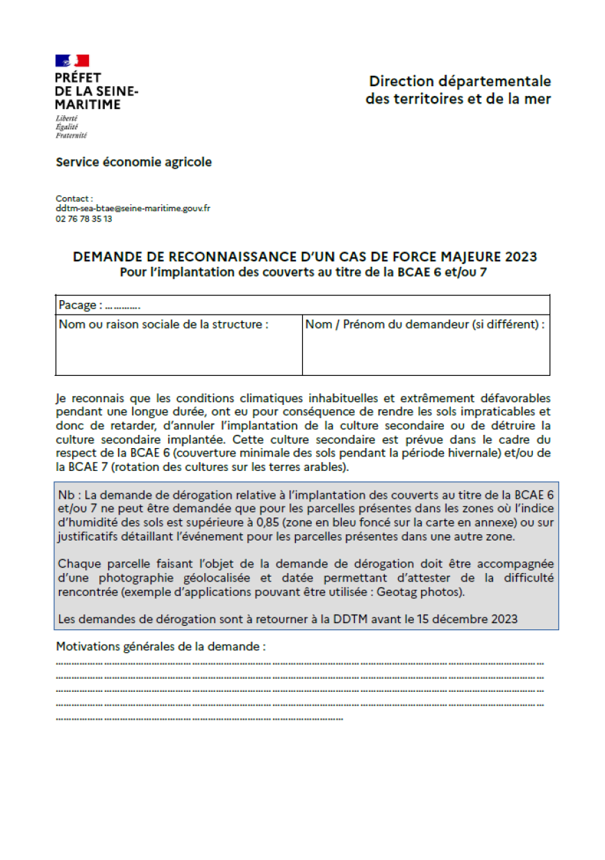 Afin d’obtenir une dérogation sur une ou plusieurs parcelles de l’exploitation, il faudra transmettre une demande de reconnaissance d’un cas de force majeur ou de circonstances exceptionnelles auprès de la DDTM. Téléchargez les formulaires de demande de reconnaissance d’un cas de force majeure 2023 pour les départements 76 et 27 :